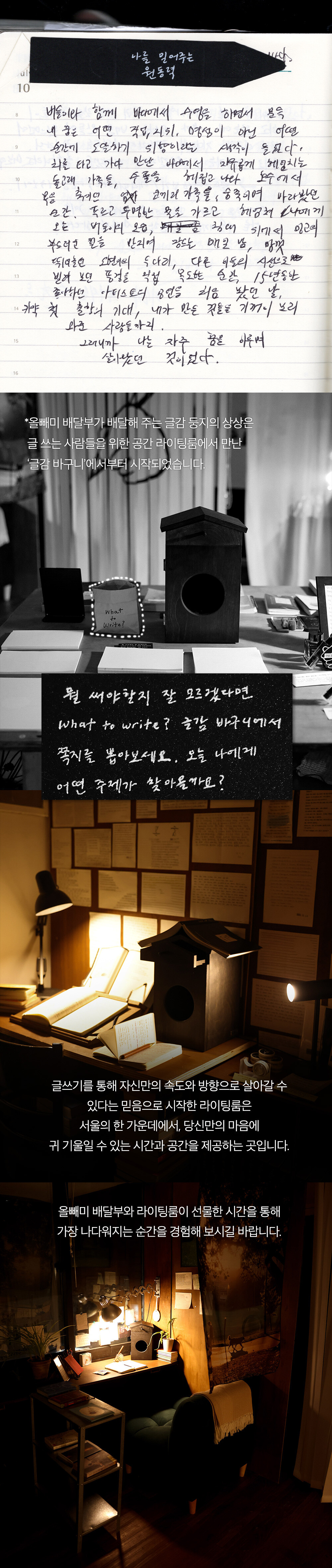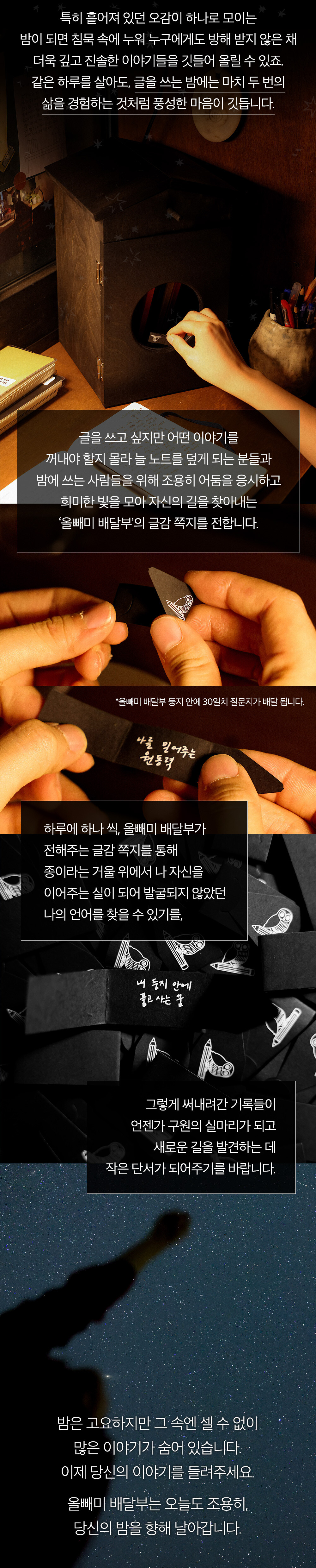 글을 쓰고 싶지만 어떤 이야기를 꺼내야 할지 몰라 늘 노트를 덮게 되는 분들과 밤에 쓰는 사람들을 위해 조용히 어둠을 응시하고 희미한 빛을 모아 자신의 길을 찾아내는 ‘올빼미 배달부’의 글감 쪽지를 전합니다.