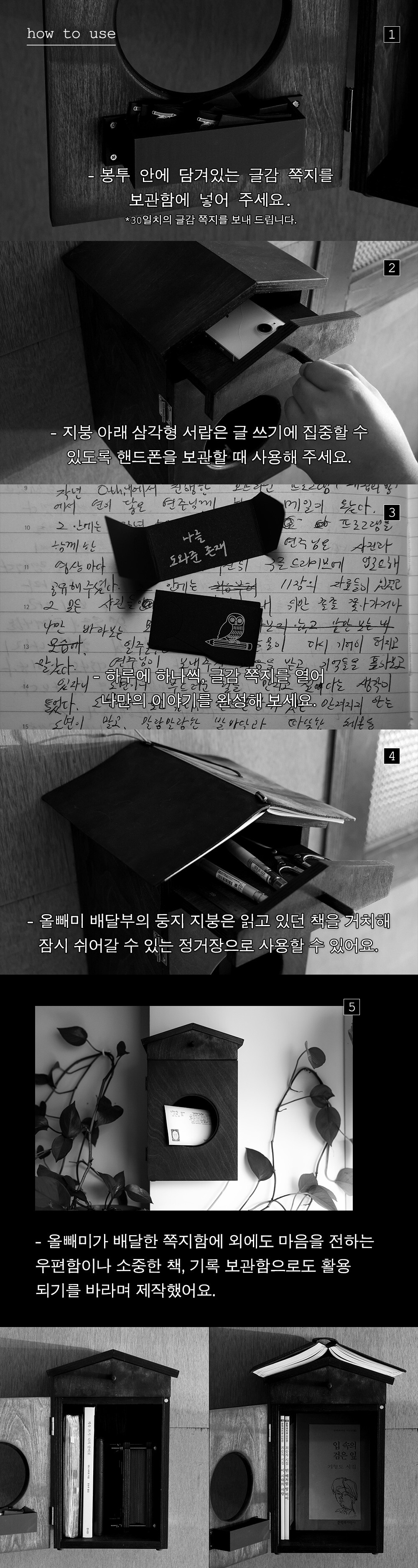 하루에 하나 씩, 올빼미 배달부가 전해주는 글감 쪽지를 통해 종이라는 거울 위에서 나 자신을 이어주는 실이 되어 발굴되지 않았던 나의 언어를 찾을 수 있기를, 그렇게 써내려간 기록들이 언젠가 구원의 실마리가 되고 새로운 길을 발견하는 데 작은 단서가 되어주기를 바랍니다.