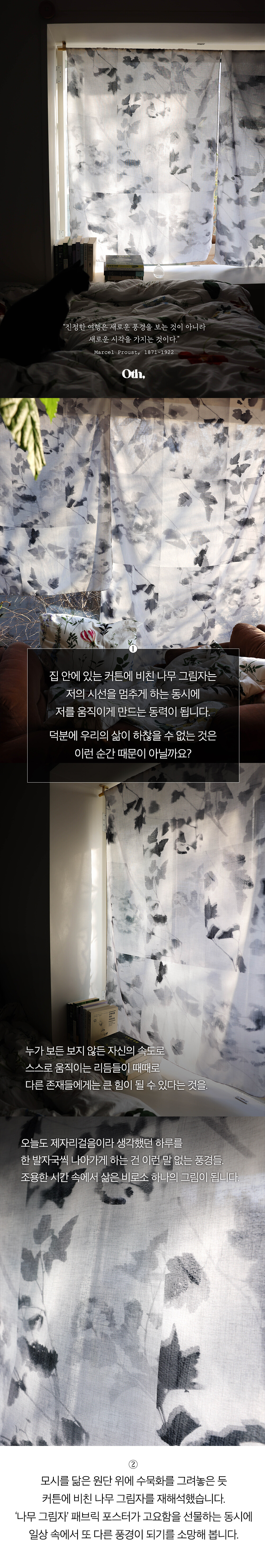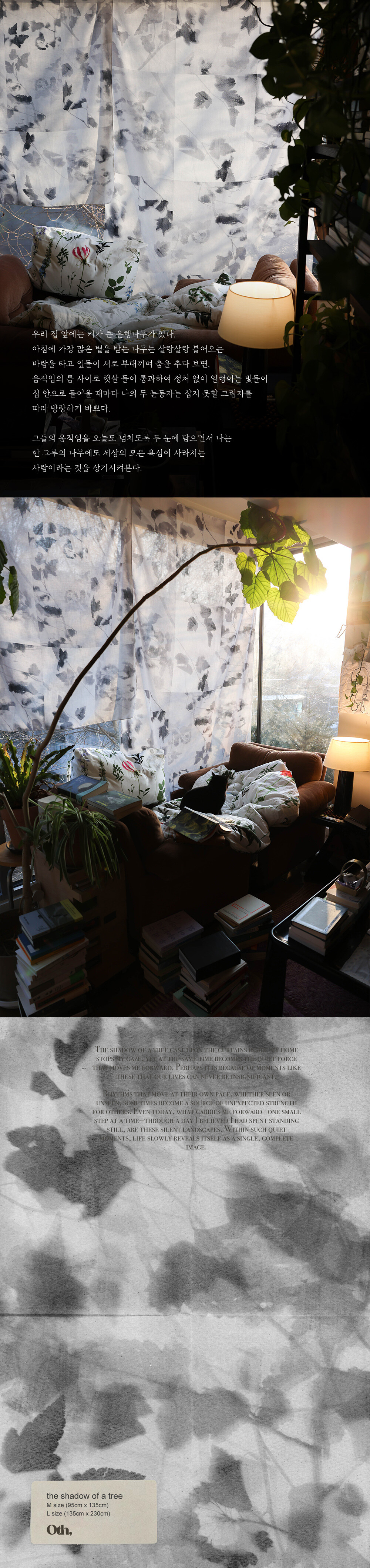집 안에 있는 커튼에 비친 나무 그림자는 저의 시선을 멈추게 하는 동시에 저를 움직이게 만드는 동력이 됩니다. 덕분에 우리의 삶이 하찮을 수 없는 것은 이런 순간 때문이 아닐까요?