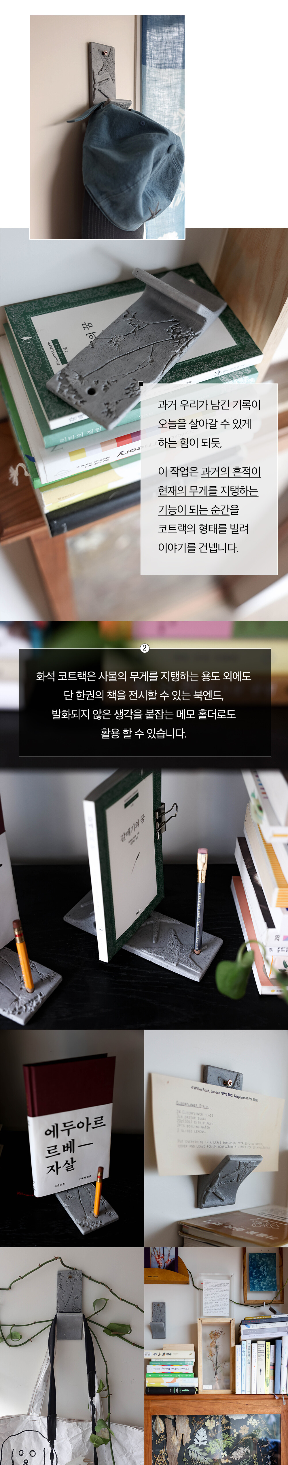 화석 코트랙은 사물의 무게를 지탱하는 용도 외에도 단 한권의 책을 전시할 수 있는 북엔드, 발화되지 않은 생각을 붙잡는 메모 홀더로도 활용 할 수 있습니다.