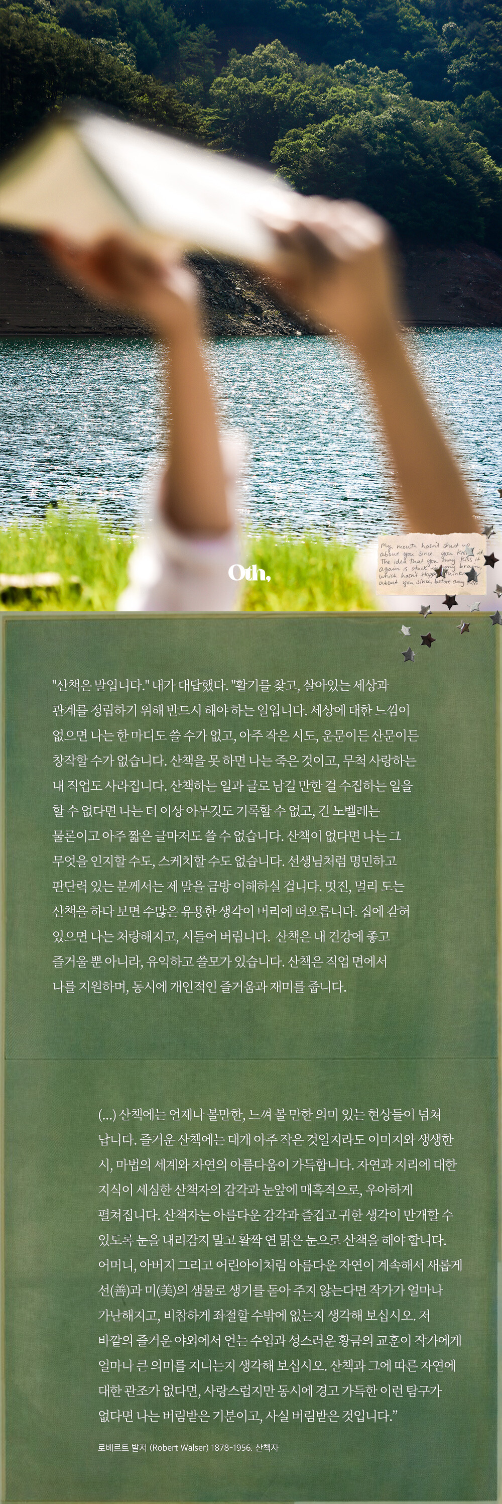 하루 중 산책은 시공간의 모든 족쇄에서 벗어나 홀가분한 마음으로 사색에 잠겨 길 위를 거닐기에 아주 좋은 때입니다. 그때야말로 나는 나와의 대화가 시작되며, 진짜 나를 대면하게 됩니다.