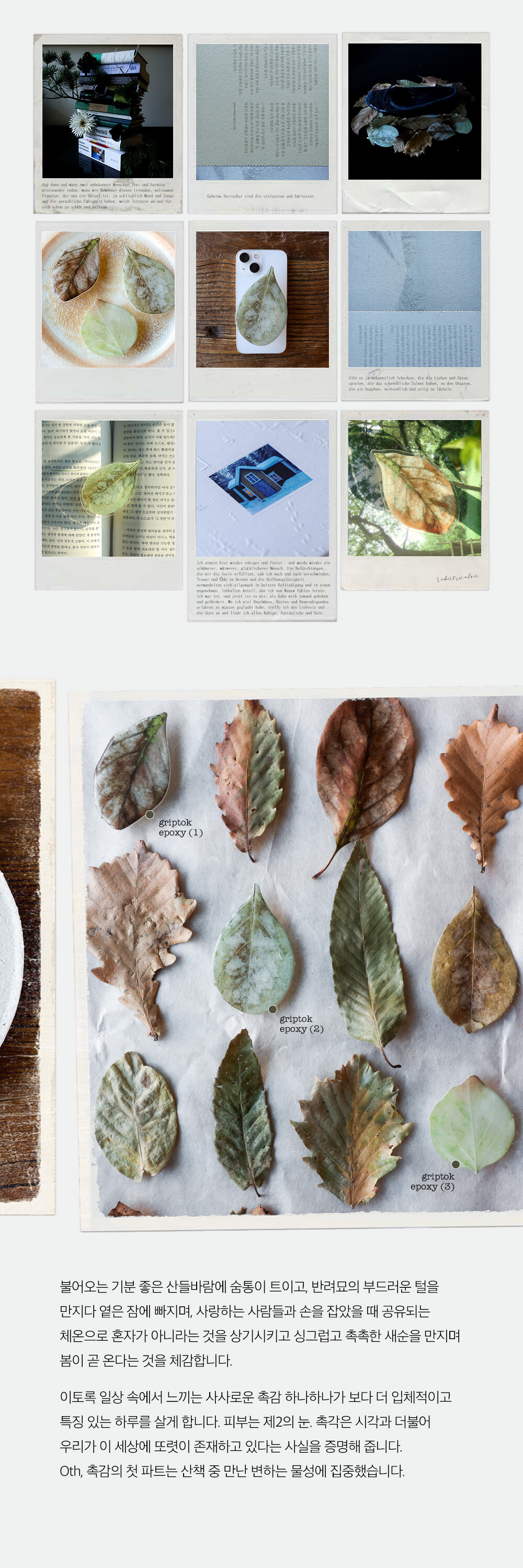 불어오는 기분 좋은 산들바람에 숨통이 트이고, 반려묘의 부드러운 털을 만지다 옅은 잠에 빠지며, 사랑하는 사람들과 손을 잡았을 때 공유되는 체온으로 혼자가 아니라는 것을 상기시키고 싱그럽고 촉촉한 새순을 만지며 봄이 곧 온다는 것을 체감합니다. 이토록 일상 속에서 느끼는 사사로운 촉감 하나하나가 보다 더 입체적이고 특징 있는 하루를 살게 합니다.