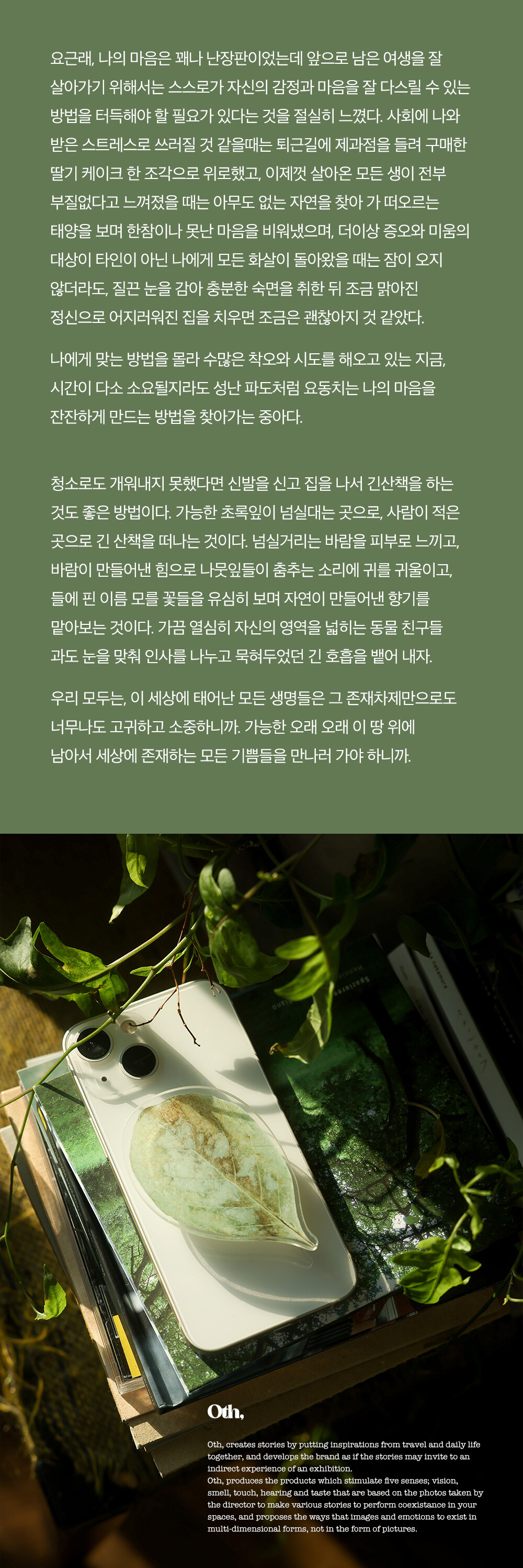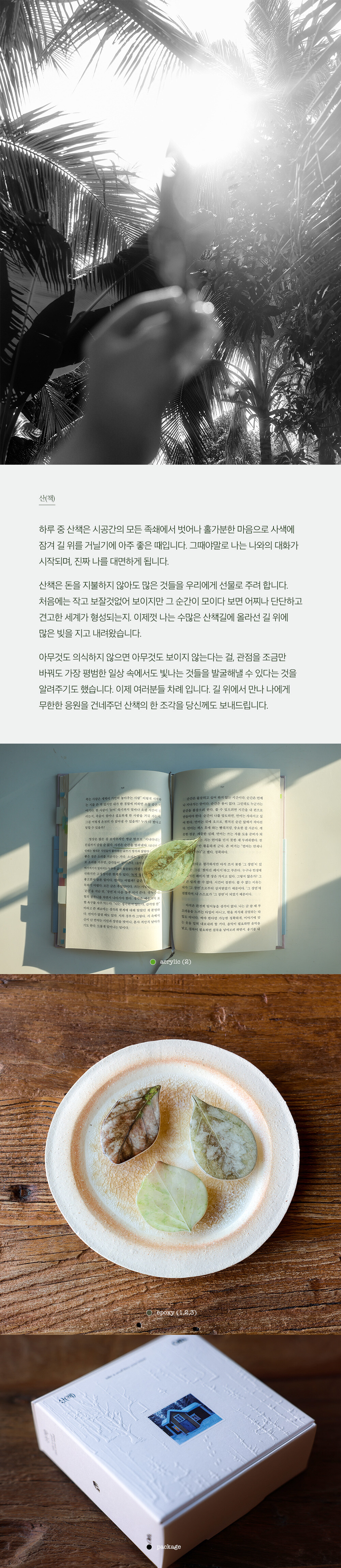 아무것도 의식하지 않으면 아무것도 보이지 않는다는 걸, 관점을 조금만 바꿔도 가장 평범한 일상 속에서도 빛나는 것들을 발굴해낼 수 있다는 것을 알려주기도 했습니다. 이제 여러분들 차례 입니다. 길 위에서 만나 나에게 무한한 응원을 건네주던 산책의 한 조각을 당신께도 보내드립니다.