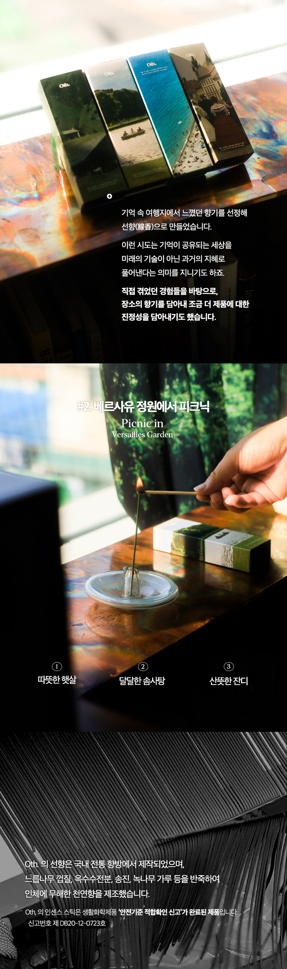 모두가 공감하는 좋은 향기는 그 공간의 분위기를 반전시켜주는 역할을 합니다. 아무리 아름다운 장소여도 향기롭지 않으면 그 모습이 반갑지 않은 것처럼. 이토록 후각은 삶의 많은 영향을 끼칩니다. 좋은 향기는 좋은 영향을 공기 중에 전파한다는 이야기를 어디선가 들은 기억이 있습니다. 얇은 가닥에 행복한 기억들을 농축해 다양한 가치관을 가진 사람들과 낭만을 나눈다. 이것은 오늘날 오티에이치콤마의 인센스 시리즈의 모토가 되었습니다.