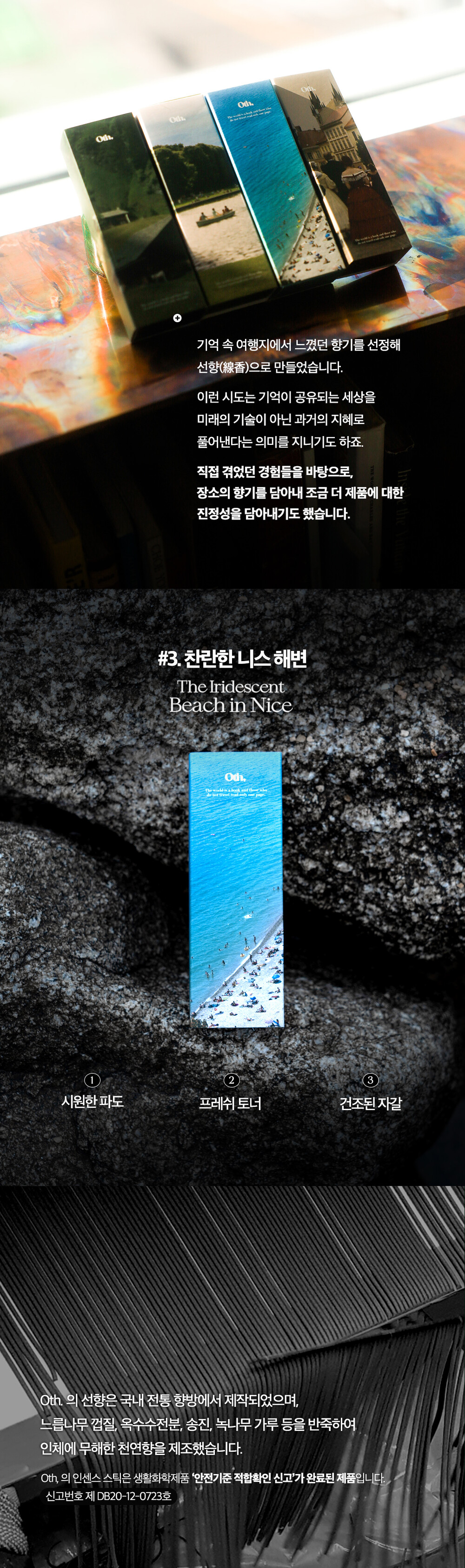 모두가 공감하는 좋은 향기는 그 공간의 분위기를 반전시켜주는 역할을 합니다. 아무리 아름다운 장소여도 향기롭지 않으면 그 모습이 반갑지 않은 것처럼. 이토록 후각은 삶의 많은 영향을 끼칩니다. 좋은 향기는 좋은 영향을 공기 중에 전파한다는 이야기를 어디선가 들은 기억이 있습니다. 얇은 가닥에 행복한 기억들을 농축해 다양한 가치관을 가진 사람들과 낭만을 나눈다. 이것은 오늘날 오티에이치콤마의 인센스 시리즈의 모토가 되었습니다.