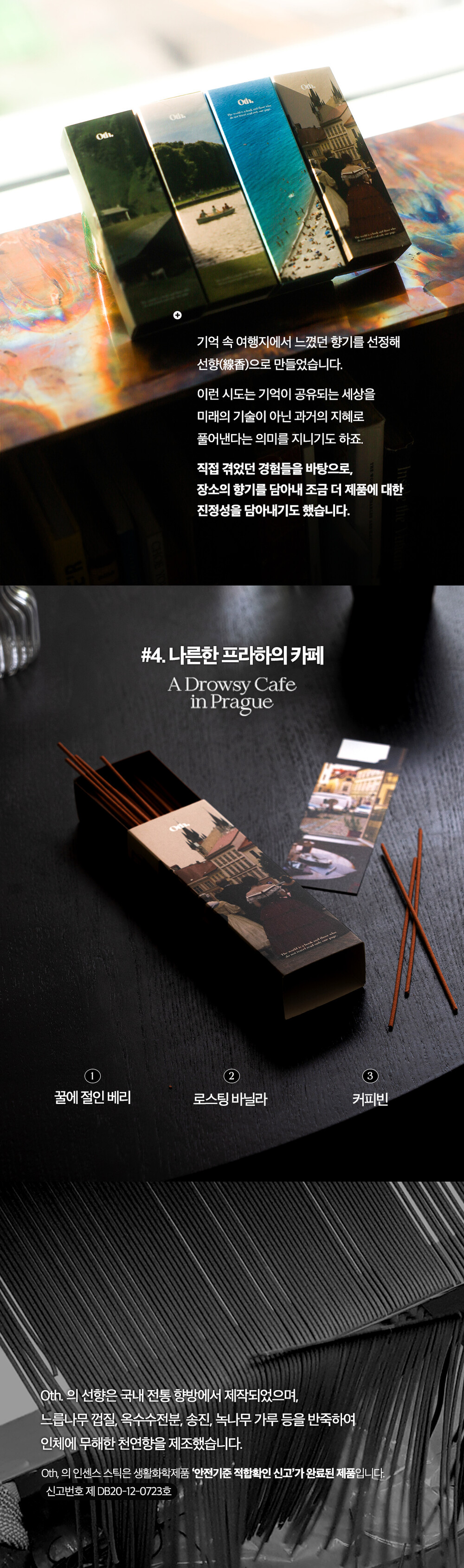 모두가 공감하는 좋은 향기는 그 공간의 분위기를 반전시켜주는 역할을 합니다. 아무리 아름다운 장소여도 향기롭지 않으면 그 모습이 반갑지 않은 것처럼. 이토록 후각은 삶의 많은 영향을 끼칩니다. 좋은 향기는 좋은 영향을 공기 중에 전파한다는 이야기를 어디선가 들은 기억이 있습니다. 얇은 가닥에 행복한 기억들을 농축해 다양한 가치관을 가진 사람들과 낭만을 나눈다. 이것은 오늘날 오티에이치콤마의 인센스 시리즈의 모토가 되었습니다.