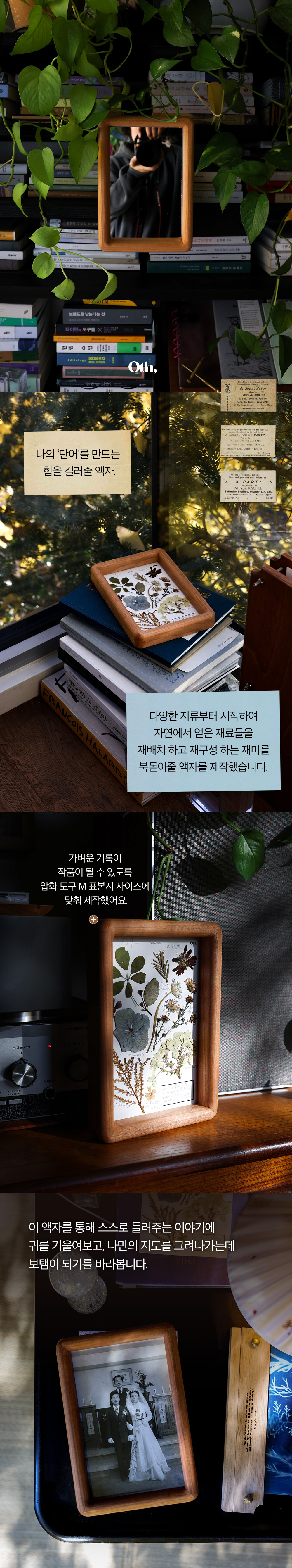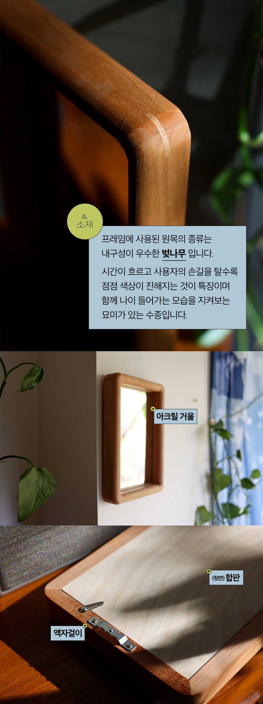 액자에 사용된 원목의 종류는 내구성이 우수한 벚나무로 시간이 흐르고 사용자의 손길을 탈수록 점점 색상이 진해지는 것이 특징이며, 함께 나이 들어가는 모습을 지켜보는 묘미가 있는 수종입니다.