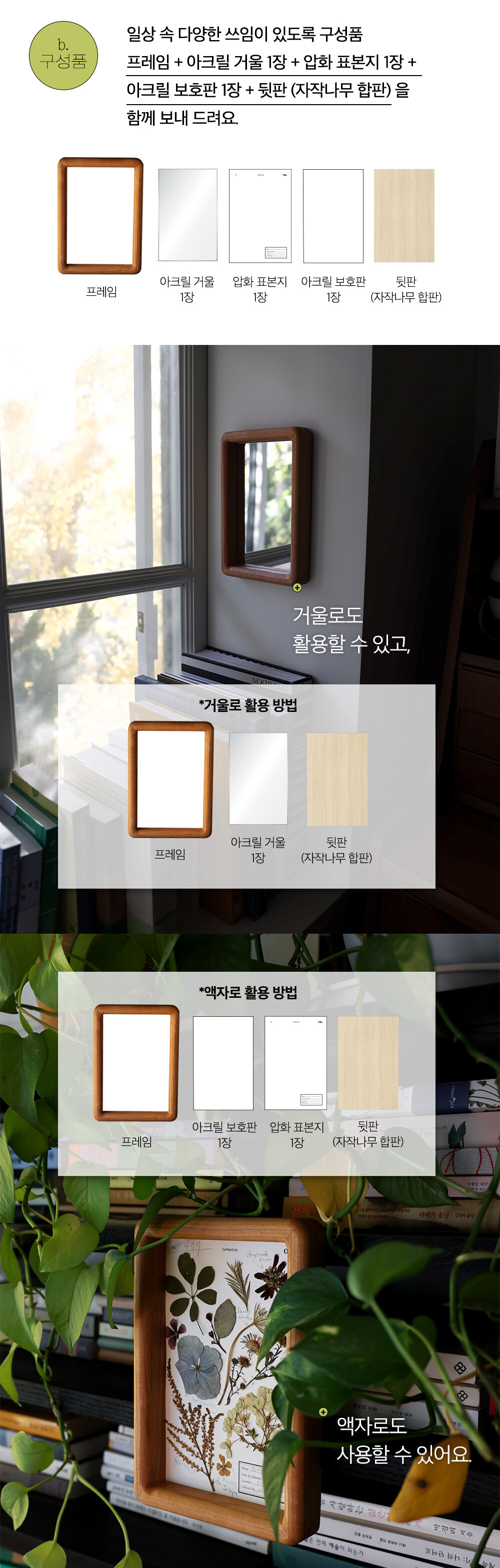 *구성품. 프레임 + 표본지 1장 + 아크릴 거울 1장 + 아크릴 보호판 1장 + 뒷판 (자작나무 합판)
